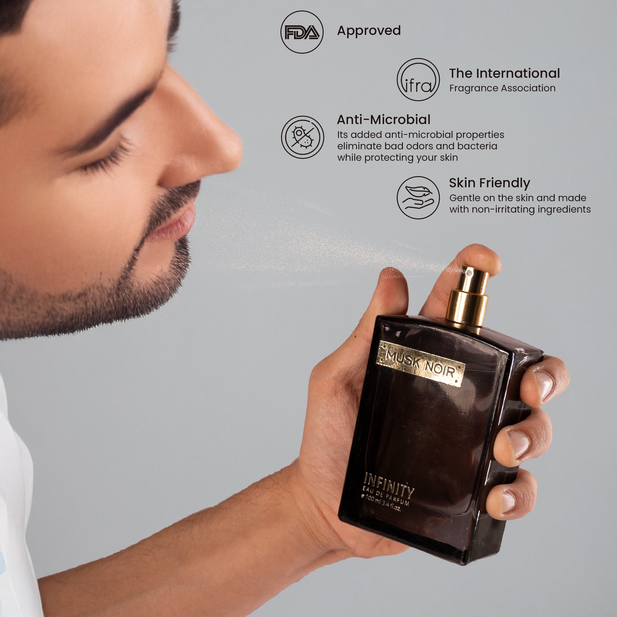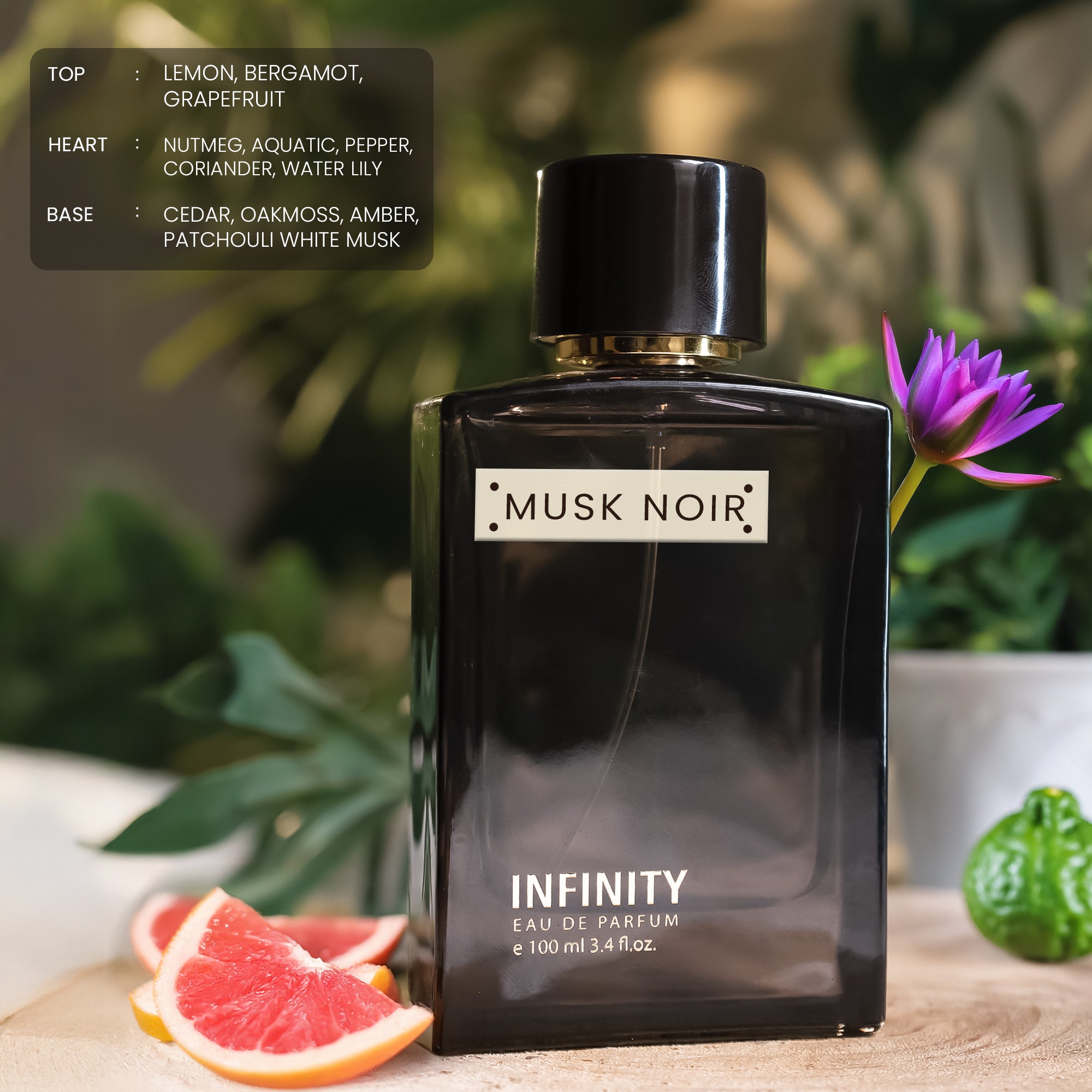 Musk Noir EDP: This aromatic fragrance combines fresh Lemon, Mandarin Orange, Mint, Cinnamon, Vetiver, and White Musk. Let Infinity Musk Noir be your signature scent, empowering you to make a lasting impression wherever you go.
