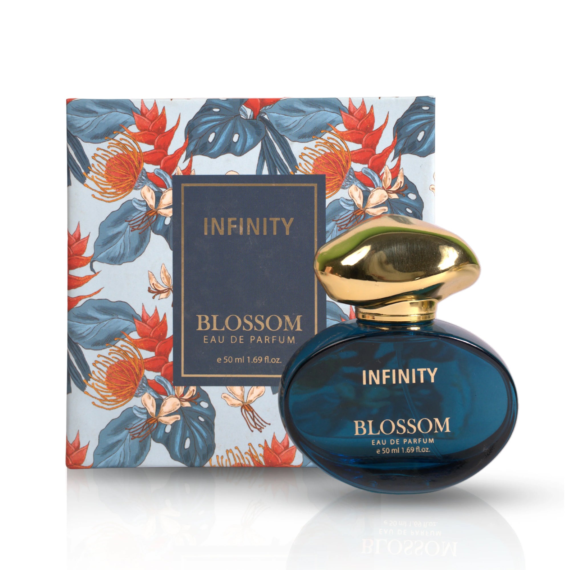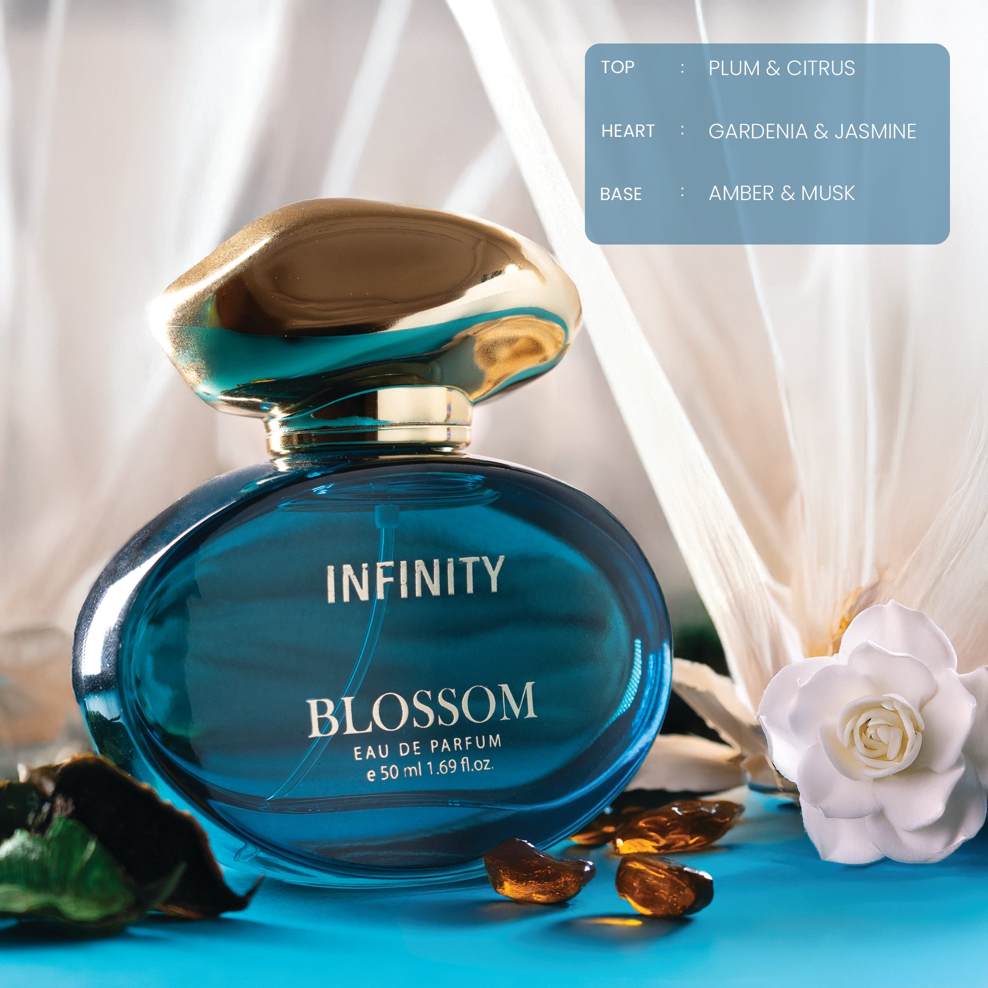 Blossom EDP: A floral note of Plum, Citrus, Gardenia, and Jasmine in the Top & Heart Closed with Amber and Musk in the Bottom Notes. Be it a brunch, family gathering, or your regular day, all you want is floral freshness lasting all day long. Let Infinity Blossom Perfume do that for you.