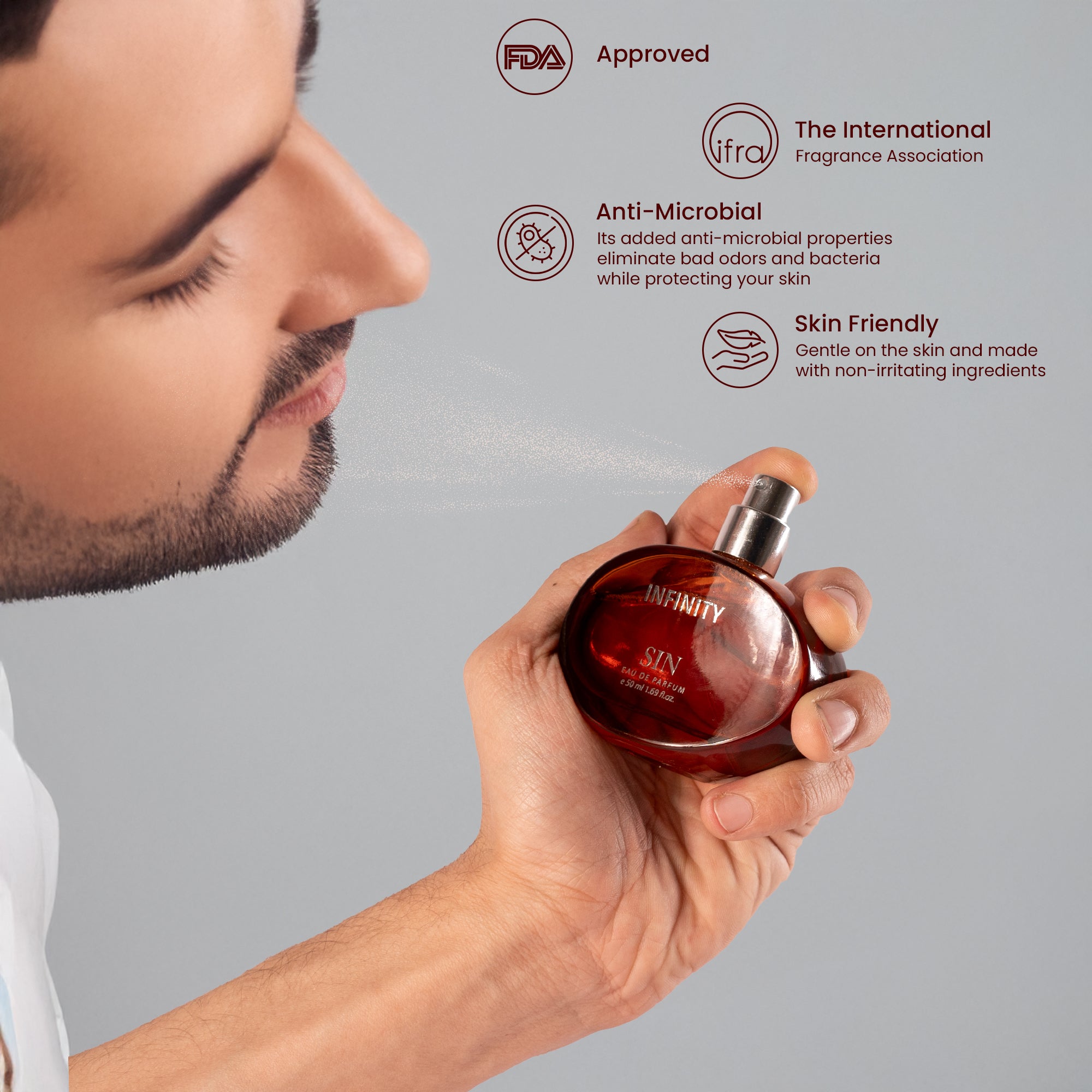 Sin EDP: Discover SIN, a magnetic fragrance embodying potent allure. Opulent spices, delicate florals, and warm ambers create an alluring blend, leaving a mesmerizing trail. Perfect for the modern, charismatic individual seeking sophistication and excitement.Ā