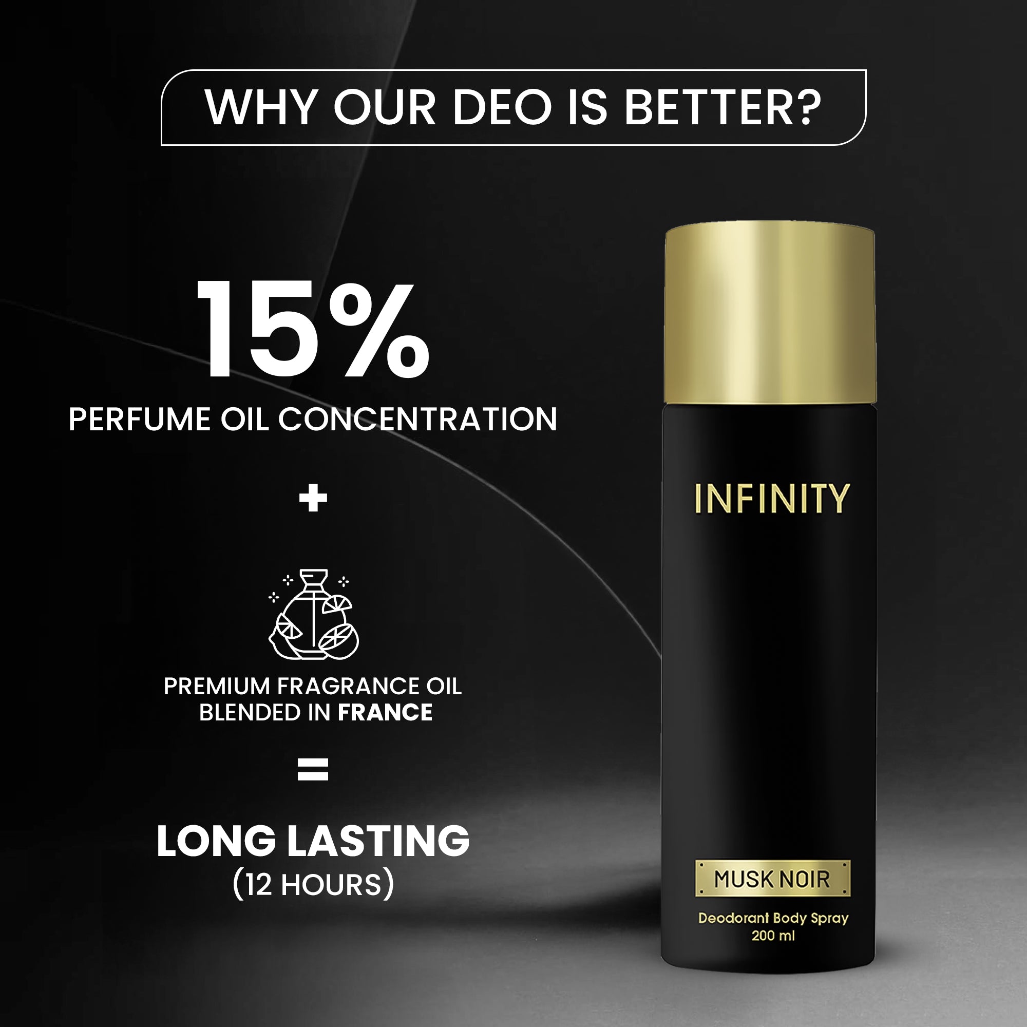 Musk Noir Deodorant: Unleash your inner power and embrace your individuality with Infinity Musk Noir, the elixir that defines confidence and allure. This aromatic fragrance combines fresh Lemon, Mandarin Orange, Mint, Cinnamon, Vetiver, and White Musk. Let Infinity Musk Noir be your signature Deo, empowering you to make a lasting impression wherever you go.