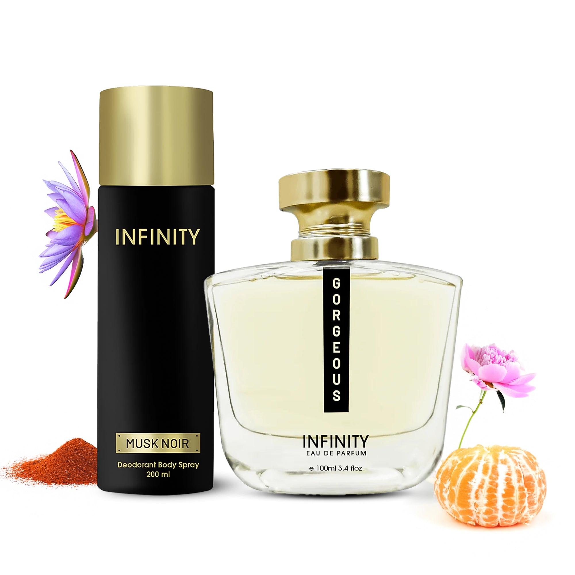 Gorgeous EDP: Unveil your inner beauty with Infinity Gorgeous, a fragrance that celebrates the essence of your individuality. This captivating perfume, belonging to the floral-fruity family, combines Madagascar Vanilla, Powdery Musk, Lemon, Mandarin Orange, Mint, Cinnamon, Vetiver, Ambergris, and White Musk.