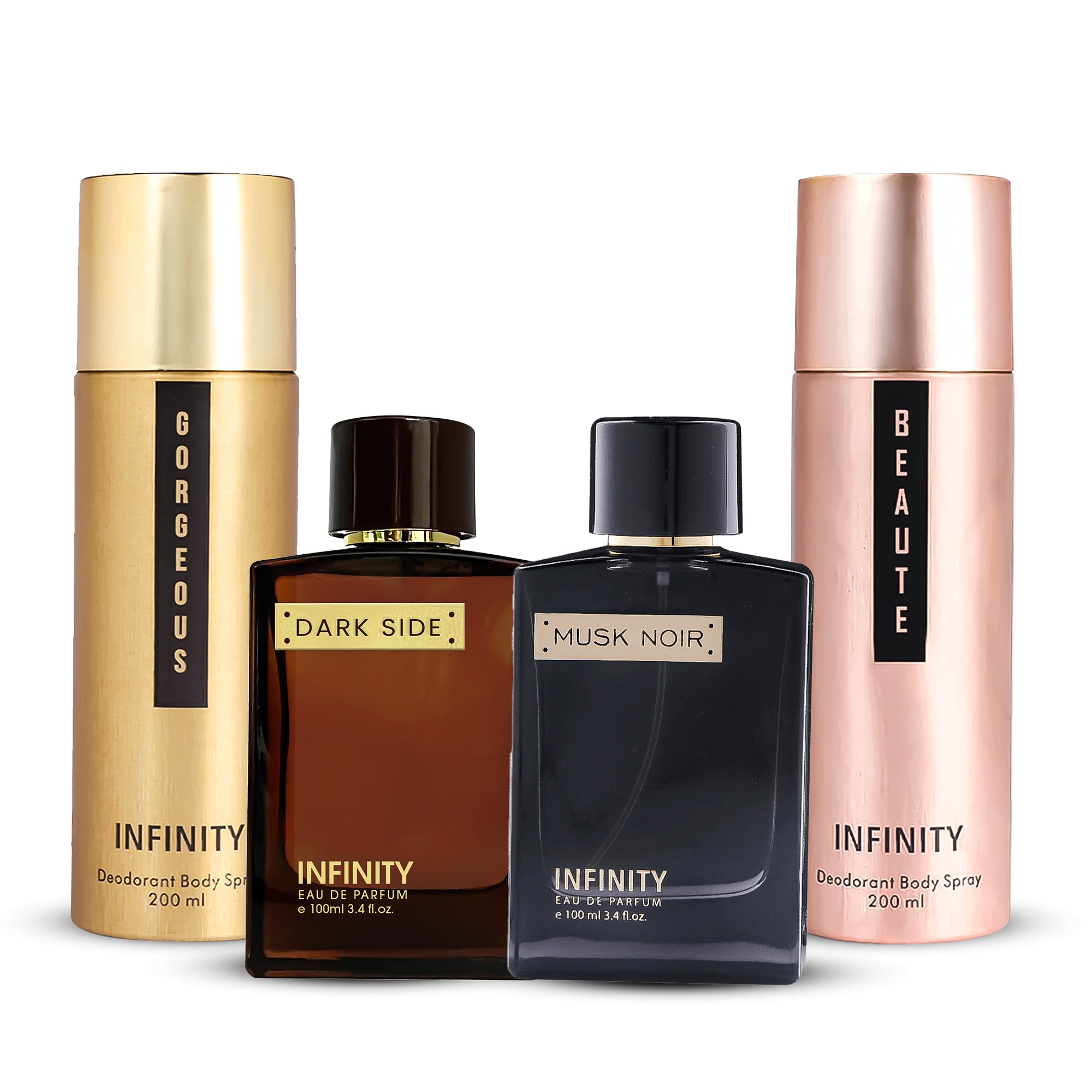 This combo includes 2 EDPs and 2 Deos, i.e., Dark Side EDP, Musk Noir EDP, and Beaute Deodorant+ Gorgeous Deodorant.