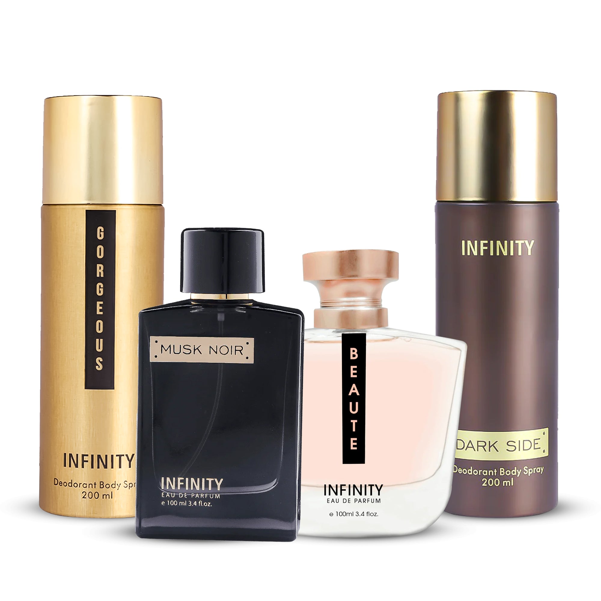 This combo includes 2 EDPs and 2 Deos, i.e., Musk Noir EDP, Beaute EDP, and Gorgeous Deodorant+ Dark Side Deodorant.