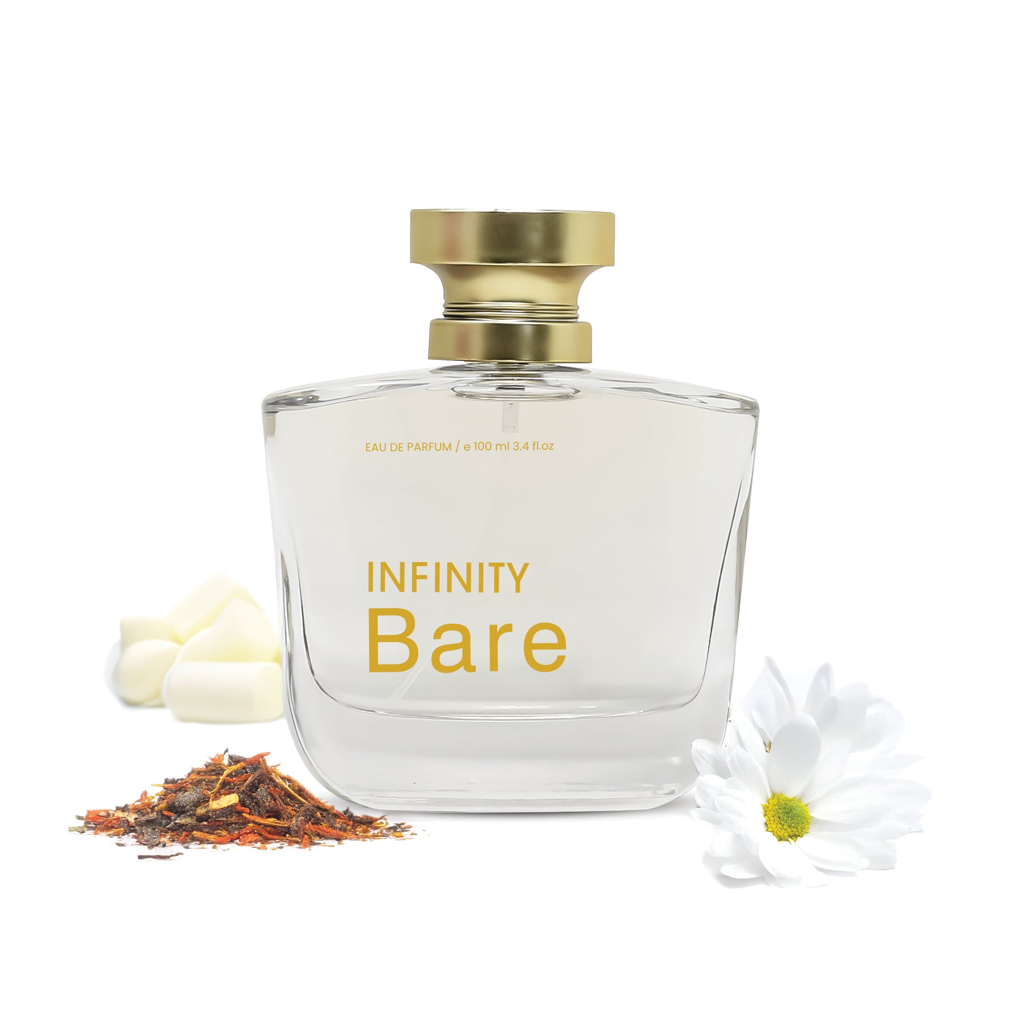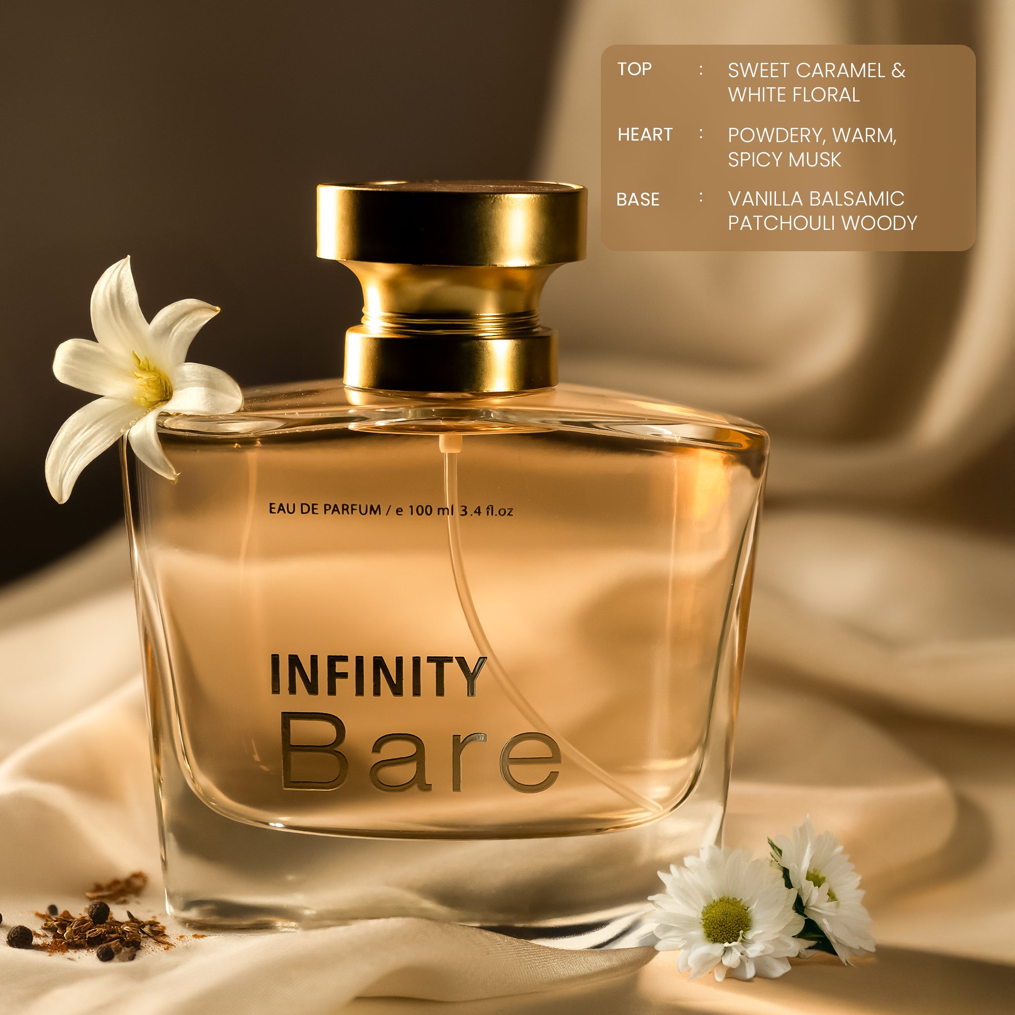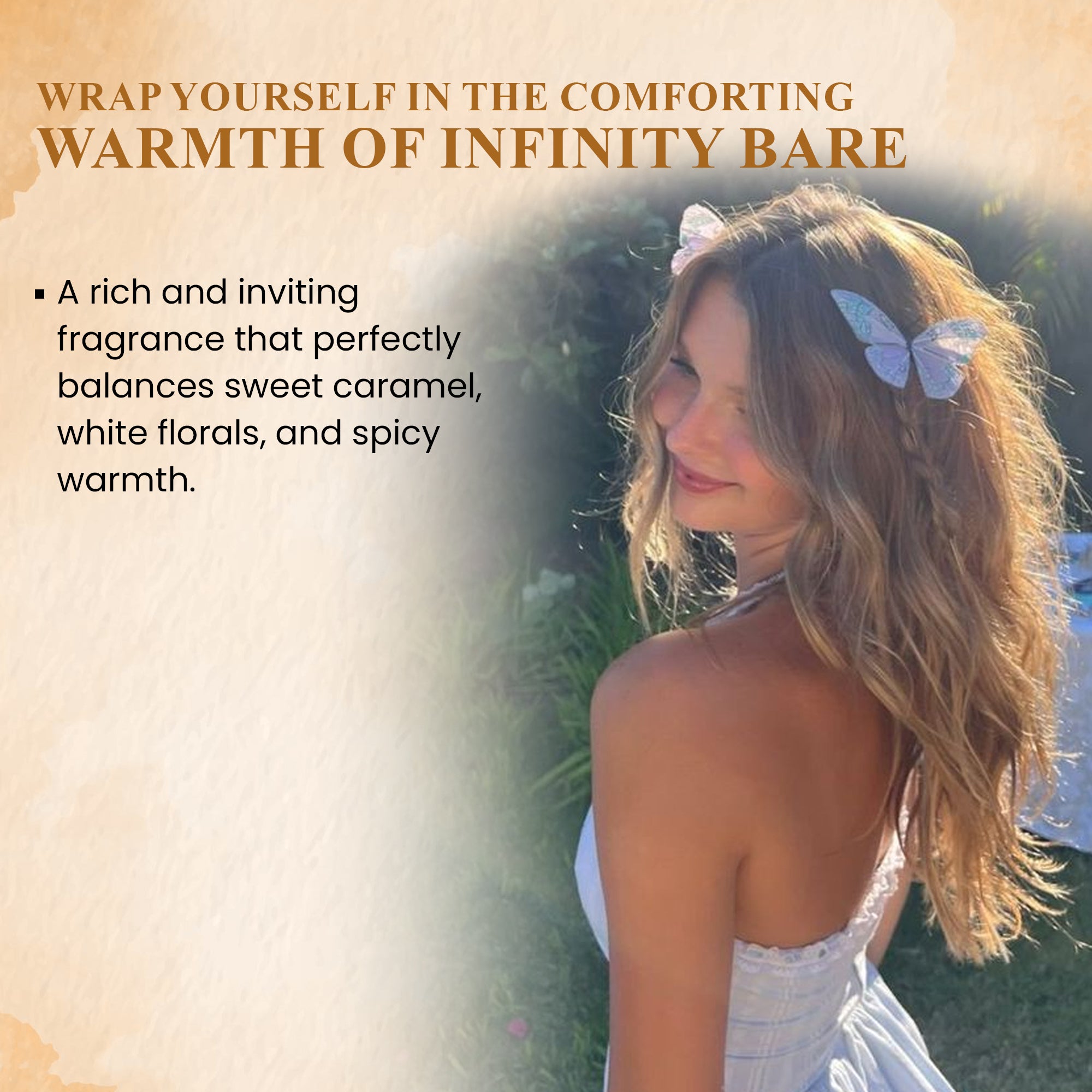 Infinity Bare: Embrace the infinite allure of nostalgia and happiness with Infinity Bare. This captivating fragrance opens with a swirl of sweet caramel and delicate white florals and the heart unfolds with a dusting of powdery musk and a touch of spicy warmth. In the end it settles into a harmonious blend of vanilla balsamic and patchouli woody notes, creating a lasting impression, much like the smile you bring to every room.